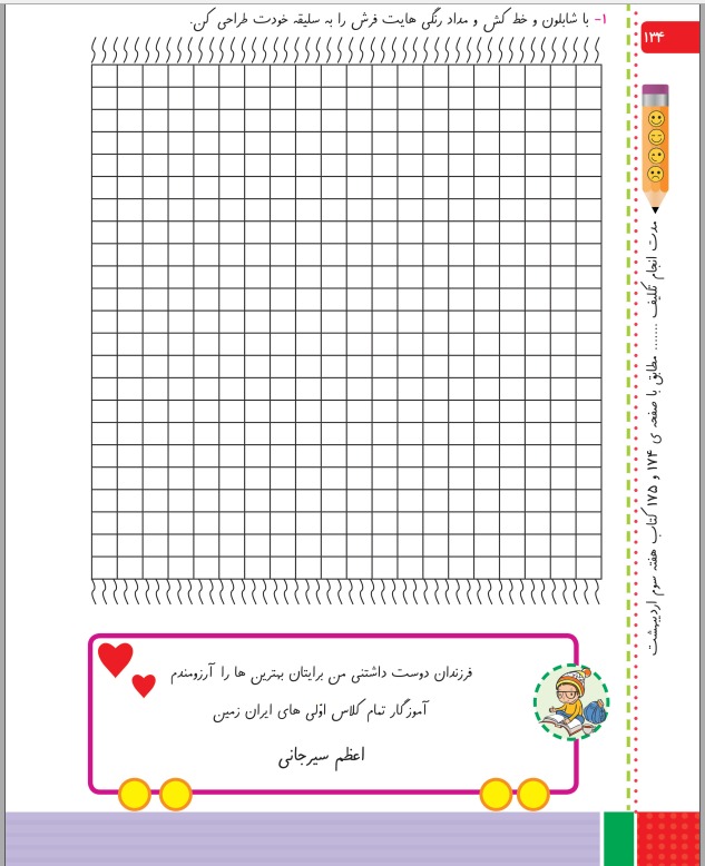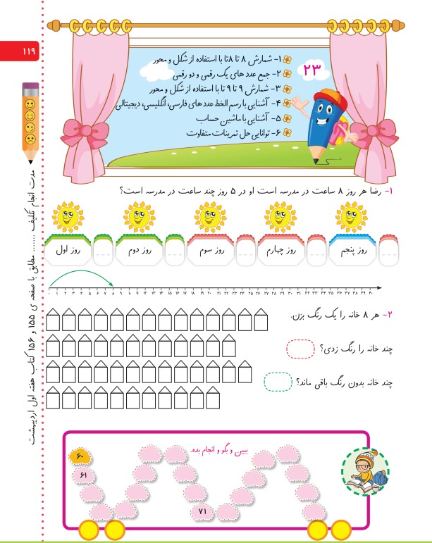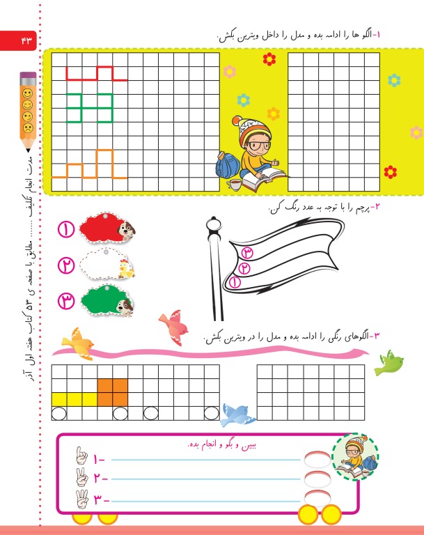 در تمام صفحات مدت انجام تکلیف از والدین خواسته شده تا بچه ها از همان ابتدا نظم در انجام تکالیف و کارهای مدرسه را یاد بگیرند.